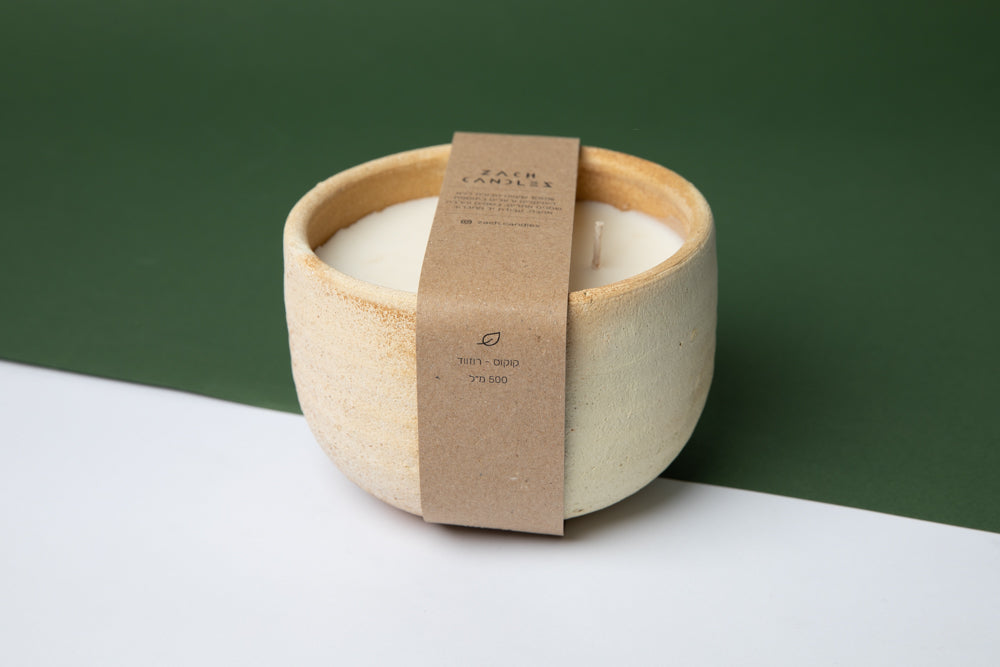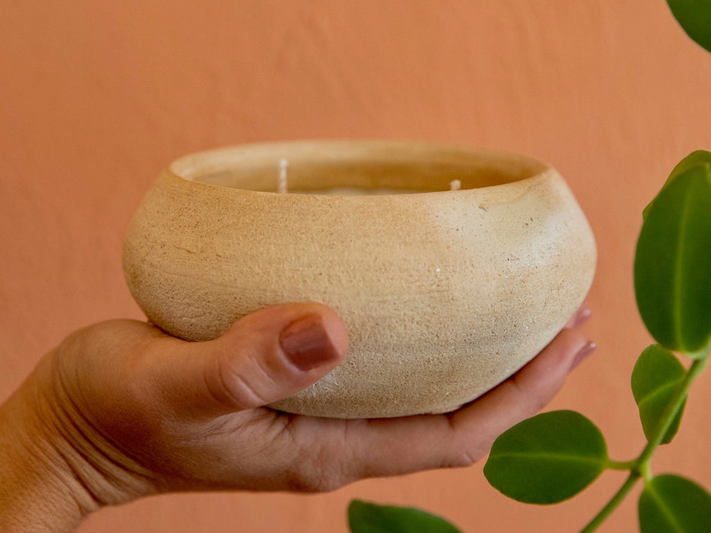 נר מעוצב בכלי חרס חברוני עבודת יד, עשוי שעווה טבעית ללא כימיקלים ופראפין. הכלי ניתן לשימוש חוזר כעציץ או ככלי דקורטיבי לבית.