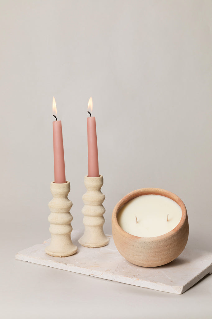 זוג פמוטים 15 ס"מ גובה - עשויים חרס בעבודת יד, בעיצוב גלי ונוח לאחיזה ביד. הפמוטים מתאימים לשימוש בשילוב נרות או כאגרטל מינימליסטי לפרחים יבשים.