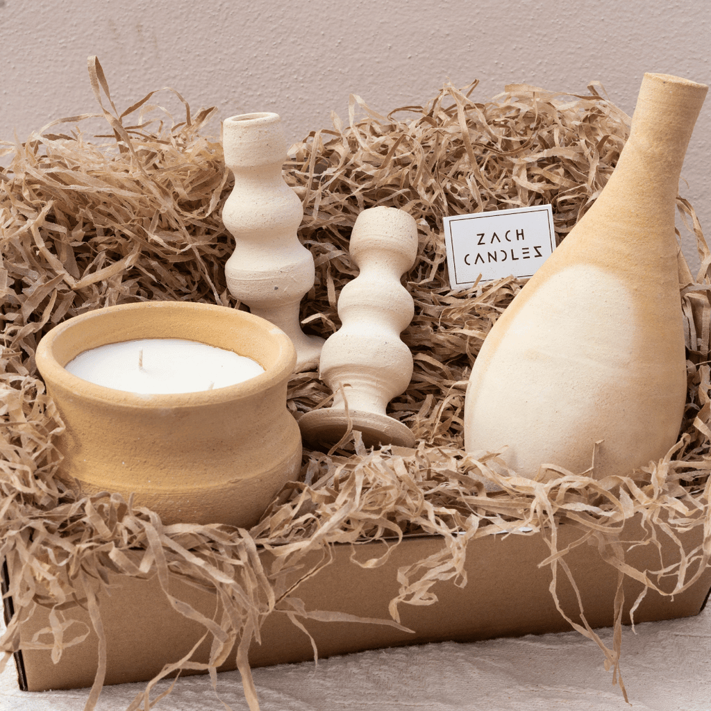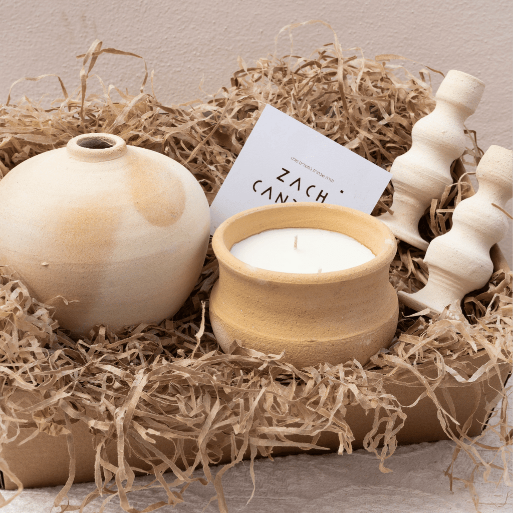 מארז נר 400 מל, שני פמוטים וואזה חרס
